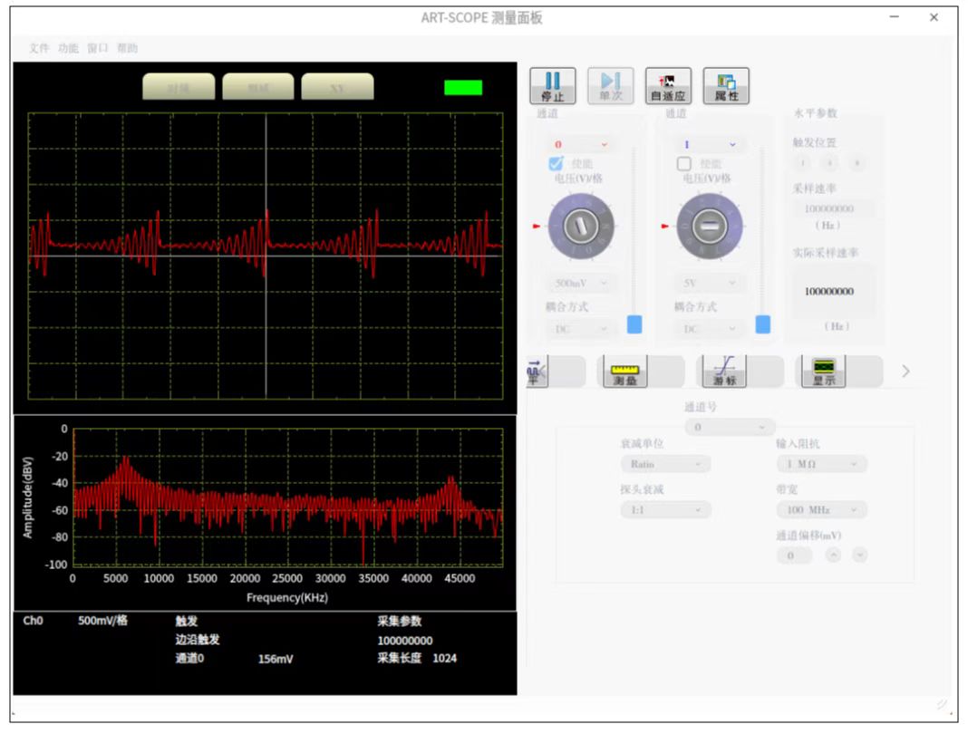 Art-Scope虛擬儀器的演示程序,驅(qū)動(dòng)PXI8910高速采集卡,在測(cè)試面板上實(shí)現(xiàn)時(shí)域、頻域、XY軸信號(hào)的顯示,可設(shè)置軟件觸發(fā)、外觸發(fā)、同步信號(hào)觸發(fā)、通道觸發(fā)等工作方式,測(cè)試面板還提供了波形的平移、游標(biāo)、測(cè)量、特征值顯示等工具控件。